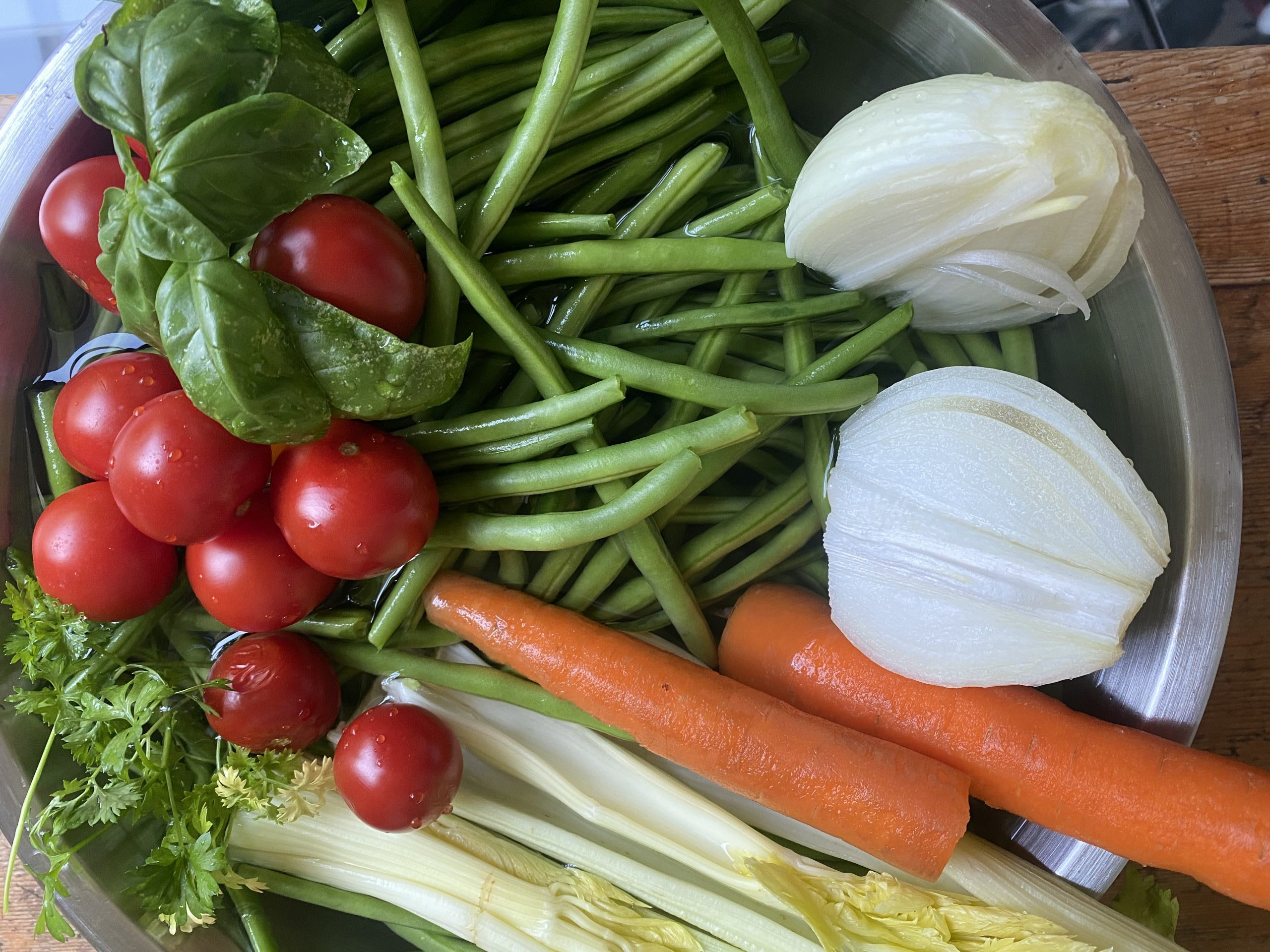 Dice all vegetables except for the string beans into 1/3 inch pieces. Clean the string beans by removing the ends. Put vegetables and string beans in the casserole. Cover the vegetables with 2 parts olive oil and 1 part vegetable broth. Cook slowly on a low flame for about 30-40 minutes with the lid on. Stir every once in a while, with a wooden spoon.